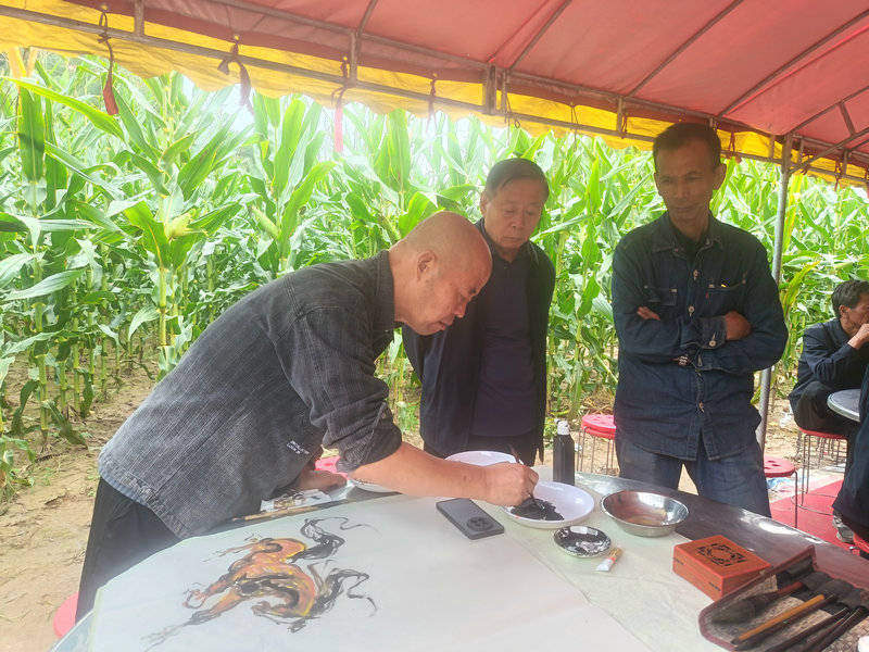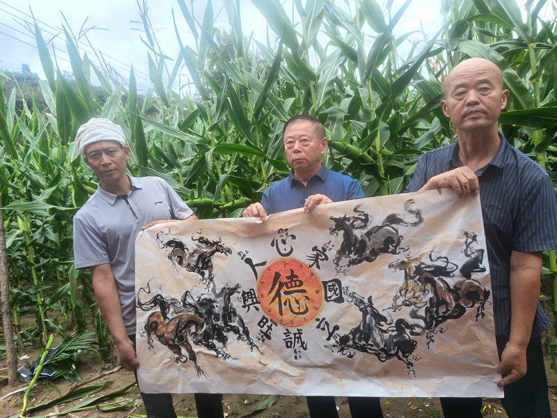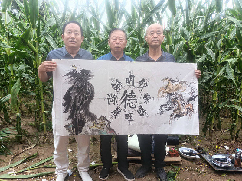 而当日上午,霍艺元率结义二弟郑海、三弟李翰迪与资深媒体人许衙评在四弟惠柏森及爱人的安排下驱车前往延安安塞,在六弟霍延亮的家乡砖窑湾镇范台村玉米地旁,诞生了主题为《八卦转运马上腾飞》书画作品。在这里,三位艺术兄弟以黄土为背景、以孝义为心纸,完成了这幅融易学哲思与写意笔墨于一体的佳作,更是对一生二、二生三、三生万物道家思想的生动诠释。