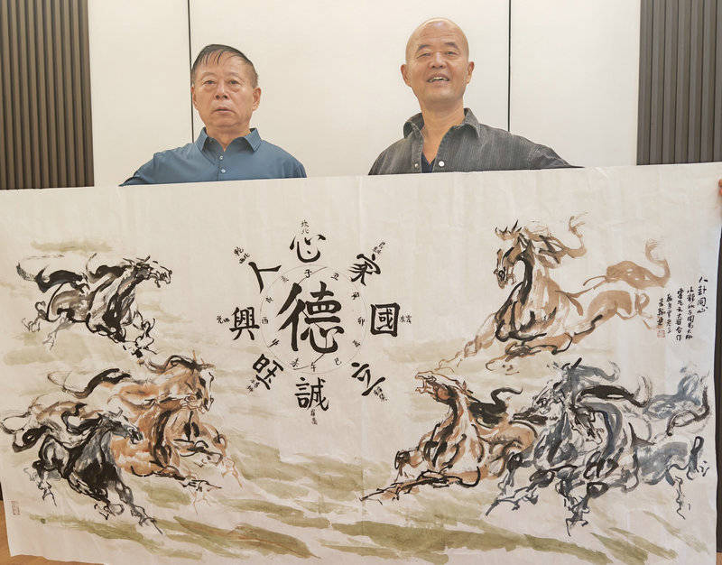 现场创作的《同德同心 中华腾飞》作品赠予霍延亮(左)