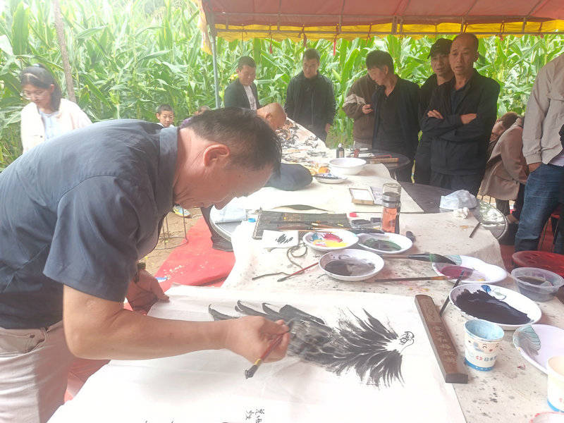 在范台村霍家院落旁,玉米成荫,黄土盈目;窑洞倚立,亲朋相聚。三人圆桌展纸,于此乡间场景中完成正式创作:
