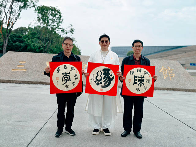 与此同时,考察团还在三星堆广场上举行了"中国古文字姓氏文化书法展公益行",吸引了一群前来研学的年轻学生。学生们围绕书法作品寻找自己的姓氏,踊跃与专家学者交流姓氏源流,与考察团成员合影留念。这场跨越时空的对话,让古老的文字成为连接不同代际的文化纽带,让久远的历史和当下的生命紧密相连。