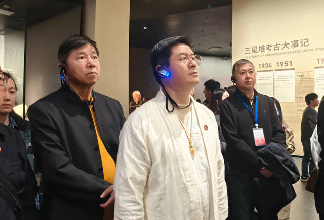 2025年10月27日,广汉三星堆博物馆,"缘行天下·走进四川"文化考察团唐健文老师一行在三星堆博物馆原副馆长、广汉市三星堆古蜀文化研究协会会长陈修元的陪同下,与中国古文字博物馆谭文贵馆长等嘉宾一同参访三星堆,为古蜀文明遗址增添了新的传承佳话。