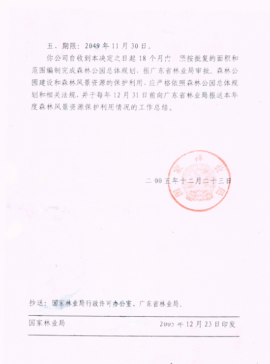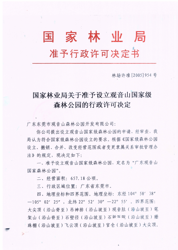 三个多月后,经广东省林业厅审核和原国家林业局验收,2005年12月23日,原国家林业局正式批准成立广东观音山国家森林公园,批文是林场许准[2005]954号。