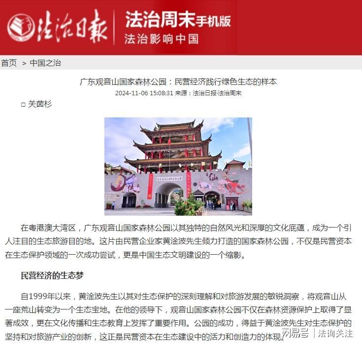11月6日法治日报·法治周末发文《广东观音山国家森林公园:民营经济践行绿色生态的样本》:社会各界希望尽快消除争议,保障公园的良性发展和民众享受绿水青山的权利。