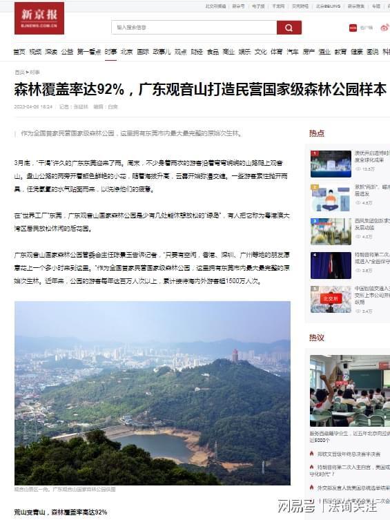 2023年4月6日新京报以《森林覆盖率达92%,广东观音山打造民营国家级森林公园样本》为题予以报道