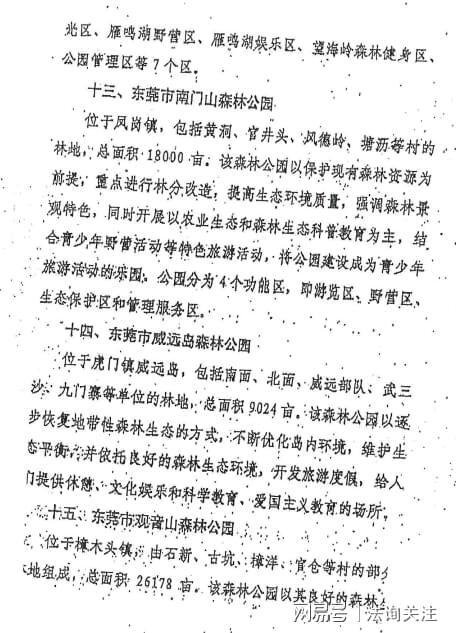 2020年12月 20日东莞市林业局《各自然保护区和森林公园简况》中位于十五的“东莞市观音山森林公园”是这样介绍的:位于樟木头镇,由石新、古坑、樟洋、官仓等村的部地组成,总面积26178亩。该森林公园以其良好的森林态环境和秀丽的湖光山色为主体,加上现代文化和宗教文化的内容,建成一处集游览性、保护性、知识性、娱乐性于一体的综合性场所,公园分为.3个功能区,即生态保护区、公园管理区和游览景区;规划有30多个景点。