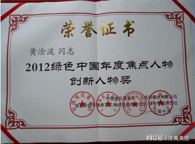 2013年10月,黄淦波获得中国绿化基金会、人民网、绿色中国年度焦点人物评选组委会、绿色中国杂志社联合颁发的“2012绿色中国年度焦点人物创新人物奖”