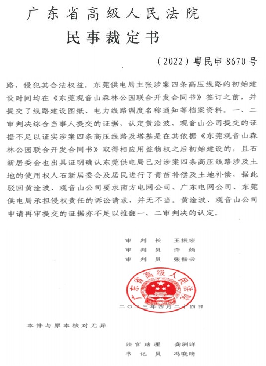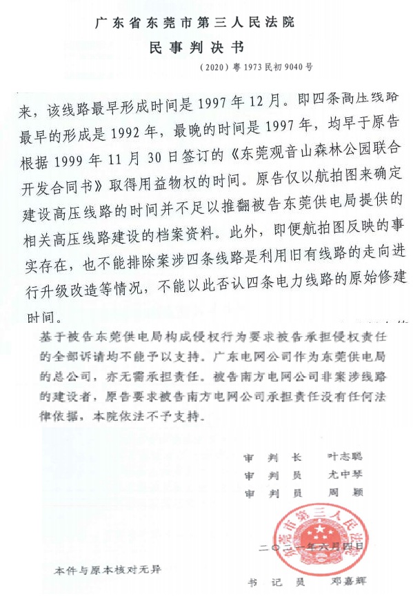 三是“根据《供用电合同》将电力供应至公园的产权分界点。在高压线塔架设纠纷中,观音山公司三次诉讼均败诉,法院认定线路建设早于公司承包经营,未构成侵权。”就此案件,多位法学专家认为:案涉四条高压线路的真实初始修建时间和是否为观音山公司承包前就已存续存在一定争议,一审、二审法院直接认定属观音山公司承包前已存续或变更升级改造而来是否得当?为何观音山均败诉?法院认为这些高压线并未架设在公园的红线范围内,故供电部门没错。而公园提供给法院证明高压线确实架设在公园范围内的证据文件《观音山国家森林公园总体规划》以及各工程施工的时间等均未被法院认可。出现这种结局,如果说此案没有行政力量干预司法,鬼都不信!