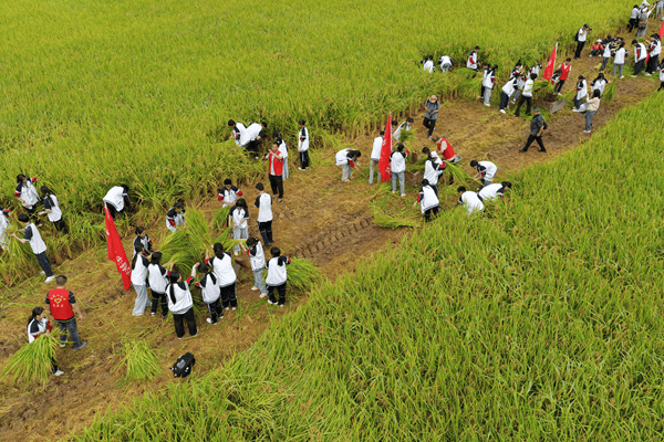 在“镰刀下的党课”中,党员教师带领学生围绕《一粒种子的长征》,结合稻谷收割解读“粮食安全”国家战略。