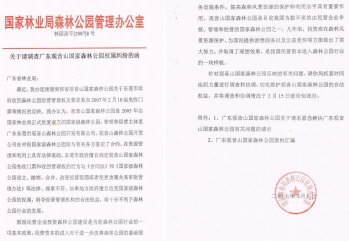 就此问题,2007 年 2 月 9 日,国家林业局森林公园管理办公室及时向广东省林业局下发林园函字[2007]8 号《关于请调查广东观音山国家森林公园权属纠纷的函》,要求广东省林业局抓紧时间组织力量进行调查和协调,切实维护观音山国家森林公园的合法权益并指出:观音山国家森林公园是 2005 年由国家林业局正式批复成立的国家森林公园,管理和经营主体是东莞市观音山森林公园开发有限公司。东莞市政府擅自规定观音山国家森林公园免收门票和收回管理权的行为与《合同法》和《国家级森林公园设立、撤销、合并、改变经营范围或者变更隶属关系审批管理办法》等法律、规章不符。