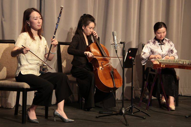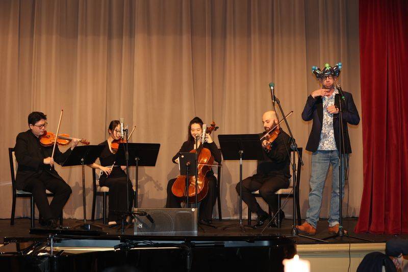 音乐宴会节目精彩纷呈,包括: 多年跟随原中国京剧院演员张燕燕学习的Emily Lam 连唱带双剑舞功的京剧《霸王别姬》选段;李德伦弦乐四重奏演奏根据Michael Jackson “Man in the Mirror” 改编的四重奏;专程从渥太华来表演中国传统魔术的Shirley Gao 高诗雅, 纯熟的表演让人很难相信她还是一个中学生;气球大师Sean Rooney 用一个气球瞬间做出中文“牛”字, 并用气球作成口笛, 当场在钢琴五重奏伴奏下表演了莫扎特歌剧《魔笛》中夜女王的著名咏叹调;在多伦多落户不久的男中音歌唱家张峰在夫人钢琴家但莉伴奏中演唱了Verdi 歌剧《游吟诗人》咏叹调等,赢得观众赞叹, 他将在2026年《中西汇粹新年音乐会》 上演唱《黄河颂》和意大利歌剧选曲;曾获肖邦国际古钢琴比赛第一名的年轻钢琴家Eric Guo 演奏了Debussy 的音画集选曲。晚宴音乐会压轴节目是 Eric Guo 改编的电影《满城尽带黄金甲》中周杰伦的名曲 “菊花台“,由全新组建的东西合璧的“洋春白雪”室内乐团,Eric Guo(钢琴)、白雪(二胡)、曹丽娜(古筝)、张韫斯(大提琴)演奏。这首乐曲改编版是首演,也将在2026年《中西汇粹新年音乐会》呈现。