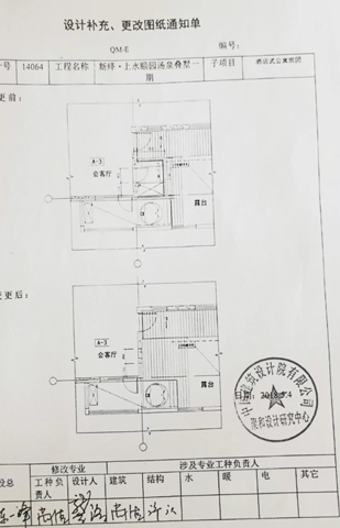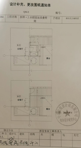 在县信访局出示的设计补充̖更改图纸通知单显示:2018年5月4日中国建筑设计院有限公司应被上诉人要求对A—3户型进行变更设计,将淋浴间设计取消。该证据系2023年3月16日县信访局组织的听证会中,被上诉人代表所出示,因为是红章,但是是扫描件还是原件,不知道。上诉人代理人进行了扫描留存,且在庭审中出具原始载体。然一审二次庭审中,被上诉人又出具了另一份补充̖更改图纸通知单的复印件,其时间点显示为2015年5月4日,且未出示原件。被上诉人之观点前后矛盾,先是不承认变更规划设计,后来又在县信访局及法院出示两个时间点不同的补充更改图纸通知单的复印件,其目的在于规避签署合同的时间,以达到规避适用《商品房买卖合同》第十条约定,其行为已完全视法律为儿戏。