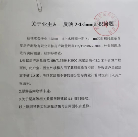 关于业主刘女士反映7—1—202面积问题住建局之证明,一、外部楼梯占据了其室内垂直空间,导致该户局部层高不够2.2米;二、原淋浴间取消未建。竣工图里有3.07米的淋浴间,被告开发商擅自删除了竣工图纸中3.07米的淋浴间,却通过了审核和验收,竣工图纸中有住建局的盖章。二实图均显示更改之后的现状。对证三补充:测绘第4个证据是测绘公司盖章的,测算书第2页建筑面积包括套内+楼梯+公用+外墙共计739.21,其中外墙面积47.45,计算书中写的参与本级分摊的分摊项面积为691.76,已计算了外部楼梯面积。根据证五关于房屋建筑面积计算与房屋权属登记有关问题的通知第七点楼梯已计算建筑面积,其下方空间不论是否利用均不应计算面积。也就是说,楼梯间不仅卖了,而且还计算了两次面积。属于双重计算面积违约违法。淋浴间的面积为3.07平方米。分层分户图显示的就是未计入面积的部分,0.8乘以2.3共计1.955, 3.07加1.955等于5.025,再加上双重计算楼梯的部分,即便是按照开发商所说4.82的面积差也已经超过3%。事实已达到了5%以上。按照国家规定符合退房标准。