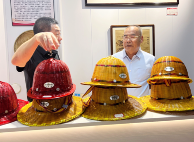 中国文旅传媒网总编甘开勤听取爱心工坊负责人林朝阳介绍竹编安全帽。