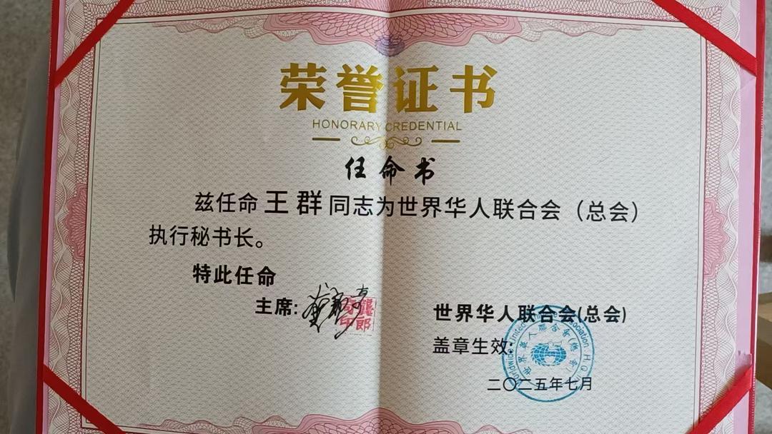 共工新闻社副社长王群先生出任世界华人联合会(总会)执行秘书长的任命书文件。