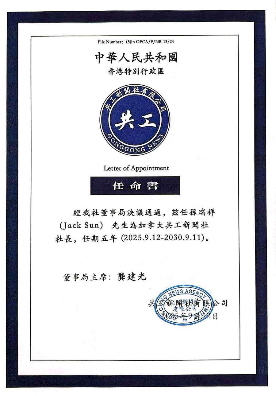 日前,经共工新闻总社董事局决议通过,正式任命孙瑞祥(Jack Sun)先生担任加拿大共工新闻社社长。加拿大共工新闻社的基本职能是负责共工新闻社在加拿大地区的通讯、采访、商业服务与宣传推广等,总部位于加拿大第一大城市多伦多。