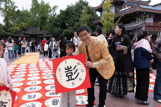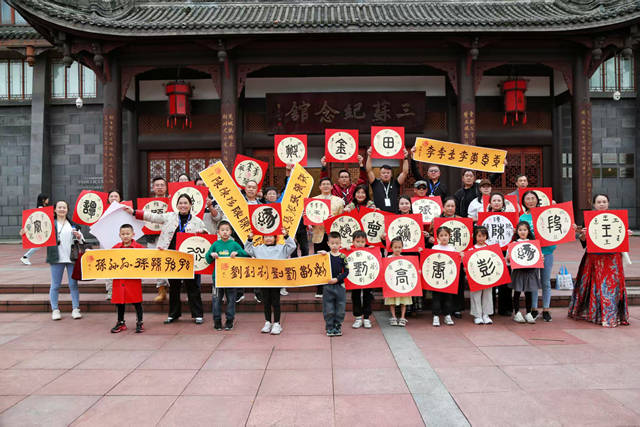 展览吸引了大量游客驻足参与,大家纷纷寻找自己的姓氏,与考察团专家深入交流姓氏源流。现场,稚童在家长帮助下认读姓氏,青年学子认真聆听讲解,中年人士仔细询问族谱记载,更有八旬长者深情讲述家族故事,构成一幅“老中青幼”四代共续文脉的生动画面。年已八十高龄的香港慈善女王赵曾学韫女士特意从香港飞赴成都,一起参加此次书法展公益行活动,她和谭文贵馆长、唐健文老师与参观者亲切互动,在三苏祠深厚文化底蕴的浸润中,共同见证姓氏文化在新时代的传承活力。