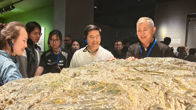 考察团一行在博物馆沿着历史的轨迹,细致观摩了那些“沉睡数千年,一醒惊天下”的珍贵文物。从神秘的青铜面具到通天的青铜神树,每一件藏品都让大家深刻感受到三星堆文化作为中华文明“多元一体”格局中的重要组成部分,其独特与辉煌。唐健文老师在参观过程中表示:"三星堆文明与古文字文化都是中华文明的重要瑰宝,将古文字研究与三星堆文明探索相结合,为我们理解中华文明起源提供了新的视角。我们要通过创新方式让这些文化遗产在新时代焕发光彩。”