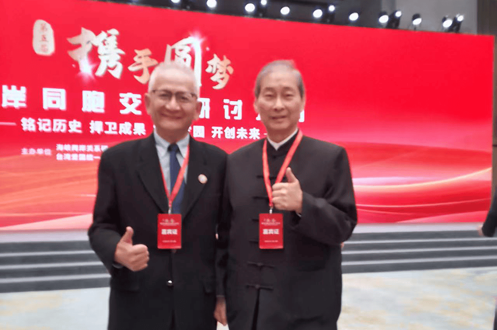图说:活动现场气氛热烈。共工新闻社中国近代文史顾问钮则坚先生,与台湾中华统一促进党总裁张安乐亲切交流并合影留念。共工社发