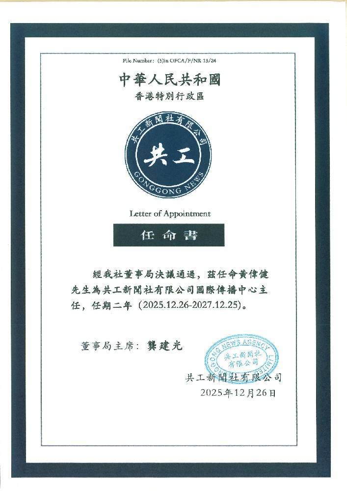 2025年12月26日,香港共工新闻社宣布重要人事任命:亚洲商业研究院秘书长黄伟健博士正式受聘出任共工新闻社国际传播中心主任。聘书由共工新闻社社长龚建光颁发。业内人士认为,此次任命不仅是媒体机构的高层人事调整,更释放出中国国际传播体系向“智库化、技术化、生态化”升级的明确信号。