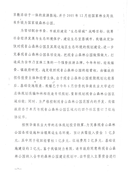 受你公司财力限制,你公司提出要在15年内投入资金近10亿元建设38项工程规划的进度难于得到保证,从长远来看影响观音山森林公园的发展。2005年东莞市政府把观音山森林公园纳入银瓶嘴森林公园规划区,拟投入大量资金,统一规划、统一建设。为充分利用市政府有关政策,争取市财政支持,把观音山森林公园做强做大,实现与你公司的双赢,我镇政府拟按市总体规划要求对观音山森林公园确立新的经营方式,由镇政府担任经营主体和投资主体。为妥善处理你公司承包经营相关事宜,我镇将安排专人负责商讨有关方案和补偿事宜。请函复。