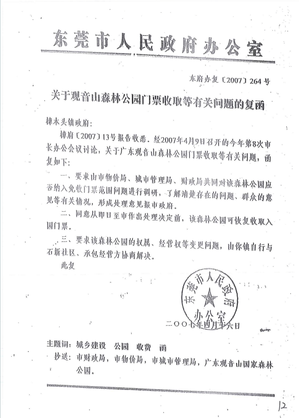 2006年12月6日,樟木头镇政府向观音山公园发出樟府函(2006)30号《关于观音山森林公园经营权调整有关问题的函》,提出:市政府已同意将观音山森林公园纳入银瓶嘴森林公园总体建设规划,工程建设资金由市镇两级按比例分担。为做好经营权调整工作,请观音山公司将相关资产、帐目清理清楚,备齐所有资料,交中介机构进行评估,待评估结果出来后再商讨股份、经营权、补偿等有关问题。