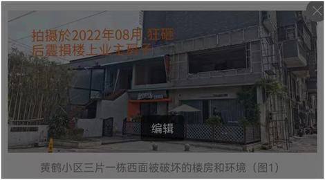 黄鹤小区三片一栋楼的实体外墙西面的整面一层、二层墙体被人为前后疯狂砸掉更换成大型落地玻璃窗后(二层还在狂砸、违建中),地基出现裂缝下沉等现象(住宅基地多为农田、水潭、河道支流等);被人为砸后,楼上业主住宅的房顶出现横向裂缝、斜向裂缝,墙体的裂缝之处被雨水渗透,出现墙壁脱落掉渣,地板震裂松动等种种损坏现象。