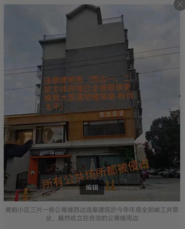 在长沙市河西岳麓区山下,有一片集高校校区和征收安置小区区域(安置小区统称自建房),楼群中夹杂数栋对外销售的公寓楼。黄鹤小区三片一栋公寓楼是其中之一栋,其原始环境适宜人类居住。但是,承包人为了蝇头小利,于2020年至2022年期间,在没有申报、没有当地政府部门任何审批手续及楼上业主不知情下,为扩大经营范围,擅自把该栋公寓楼楼房西面的一、二层实体砖墙野蛮狂砸掉,更换成大型落地玻璃窗;西北二面多处设置违章建筑等违法侵占行为。