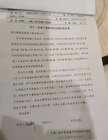 上述联系单还显示,八局量子项目部曾多次口头和两次书面通知航凯公司,要求对9根问题框架柱进行加固,但迟迟未获执行。
