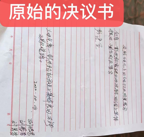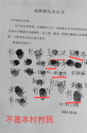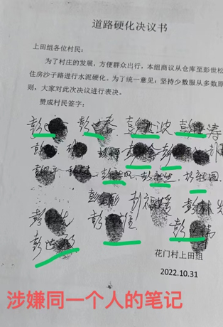 其一,全村村民都知道、都承认这条路是占用集体基本农田修建的,本人还在那块田农耕过,为什么现在就成了建设用地了?为什么上田八组30户,而道路硬化决议书上按户数签名的22户人,有5户居民不是本村村民?有十个人的签名是同一个人的笔迹,是否为了应付调查欺上瞒下匆忙补签作假?10月4日村委会负责人亲口承认是一个人代签的,在我家监控录像下说的,有视频为证。