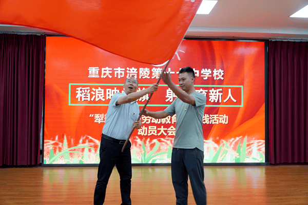 最后,学校党总支书记梁政为“青年劳动先锋队”授旗,并向全体参与者发出号召:“党员干部要带头挽起裤脚、踩进泥土,用弯腰割谷的汗水、挥镰脱粒的坚持,诠释‘脚下有泥,心中有光’的初心与担当。”