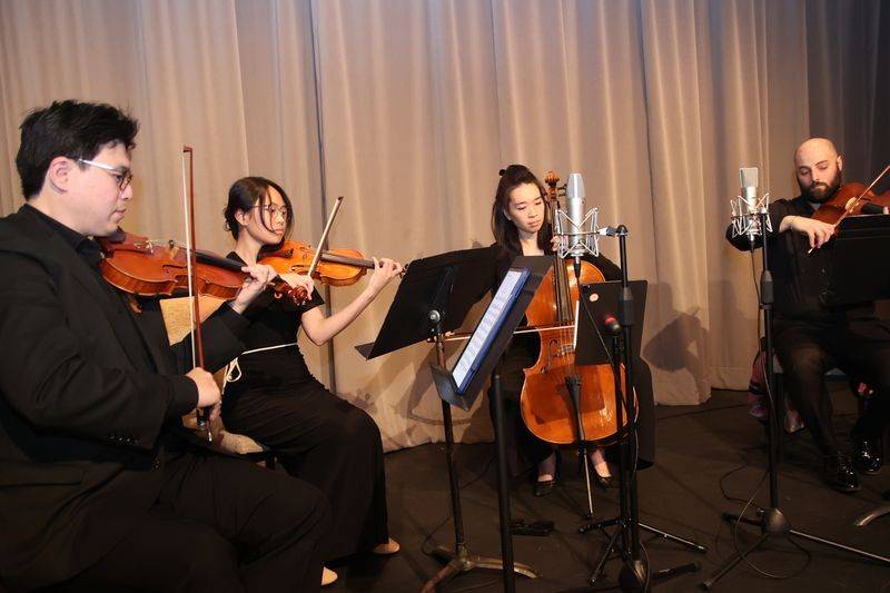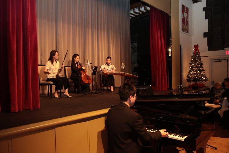 音乐宴会节目精彩纷呈,包括: 多年跟随原中国京剧院演员张燕燕学习的Emily Lam 连唱带双剑舞功的京剧《霸王别姬》选段;李德伦弦乐四重奏演奏根据Michael Jackson “Man in the Mirror” 改编的四重奏;专程从渥太华来表演中国传统魔术的Shirley Gao 高诗雅, 纯熟的表演让人很难相信她还是一个中学生;气球大师Sean Rooney 用一个气球瞬间做出中文“牛”字, 并用气球作成口笛, 当场在钢琴五重奏伴奏下表演了莫扎特歌剧《魔笛》中夜女王的著名咏叹调;在多伦多落户不久的男中音歌唱家张峰在夫人钢琴家但莉伴奏中演唱了Verdi 歌剧《游吟诗人》咏叹调等,赢得观众赞叹, 他将在2026年《中西汇粹新年音乐会》 上演唱《黄河颂》和意大利歌剧选曲;曾获肖邦国际古钢琴比赛第一名的年轻钢琴家Eric Guo 演奏了Debussy 的音画集选曲。晚宴音乐会压轴节目是 Eric Guo 改编的电影《满城尽带黄金甲》中周杰伦的名曲 “菊花台“,由全新组建的东西合璧的“洋春白雪”室内乐团,Eric Guo(钢琴)、白雪(二胡)、曹丽娜(古筝)、张韫斯(大提琴)演奏。这首乐曲改编版是首演,也将在2026年《中西汇粹新年音乐会》呈现。