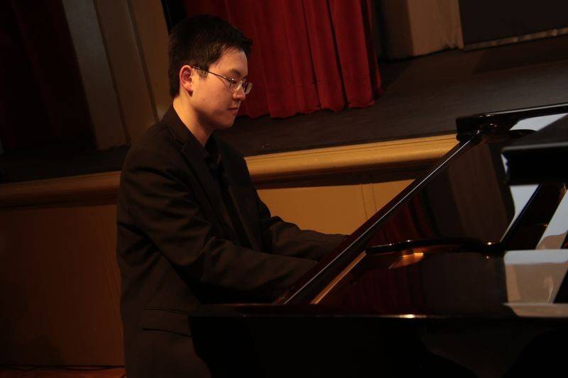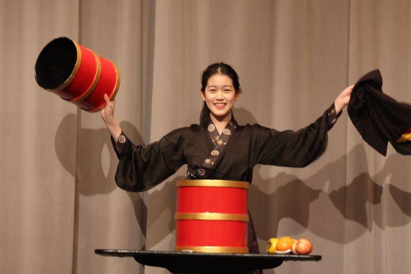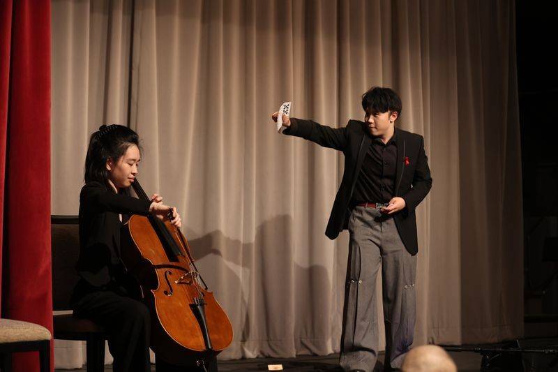 音乐晚宴还有一位青年才俊 Xirui 王希睿, 大显风采。 他是青年创业家, 来往于加拿大和中国,又是魔术师。他在Rosy 张韫斯和张科民的音乐伴奏下,表演了纸牌魔术, 就是近在咫尺都无法看出他的神奇魔术表演是怎么变的。 音乐晚宴第一个节目京剧《霸王别姬》, 张科民宣布拍卖表演霸王,王希睿拍卖成交,穿上官袍坐在舞台上观看Emily 扮演的虞姬表演。 最后压轴拍卖是在2026年《中西汇粹新年音乐会》上指挥多伦多节日交响乐团演奏最后加演施特劳斯《拉德斯基进行曲》,他又拍卖成交,大家将在新年音乐会上看到他的魅力风采。