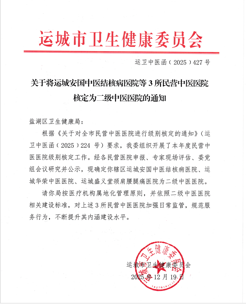 12月19日,运城医疗领域传来振奋人心的消息,运城安国医院被正式确定为二级中医医院,一同获此殊荣的还有运城盛义堂颈肩腰腿痛医院等两家民营医院,这一成果标志着运城安国医院发展踏上新征程,也为盐湖区中医药事业发展注入新动力。
