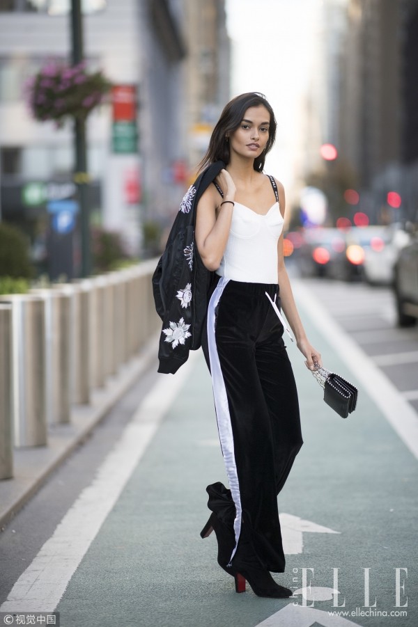 如果再大胆一些换上一条阔腿裤,上紧下松的造型搭配既性感又动感。