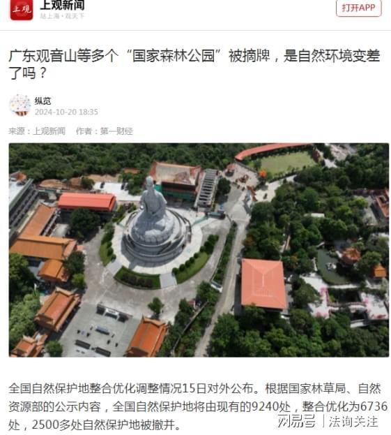 在获悉广东观音山国家森林公园位列撤销的自然保护地名单中,国内多家媒体及网络均为其鸣不平,引起了广泛关注。
