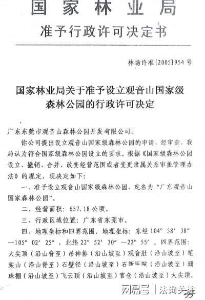 2005年国家林业局准予行政许可决定书,准予设立观音山国家级森林公园,定名为“广东观音山国家森林公园”,确定“经营面积:657.18公顷”,并认定了地理坐标和四界范围。同时确定了期限至:2049年11月30日。